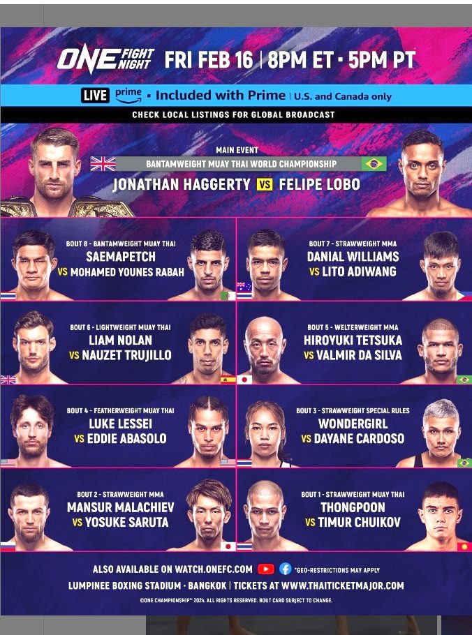 Трансляция турнира ONE Fight Night 19 начнется 17 февраля в 07:00 по бишкекскому времени на телеканале "Матч Боец".