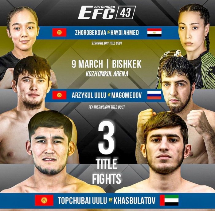 9 марта во Дворце спорта им. Каба уулу Кожомкула в Бишкеке пройдет крупный турнир по смешанным единоборствам EFC 43.