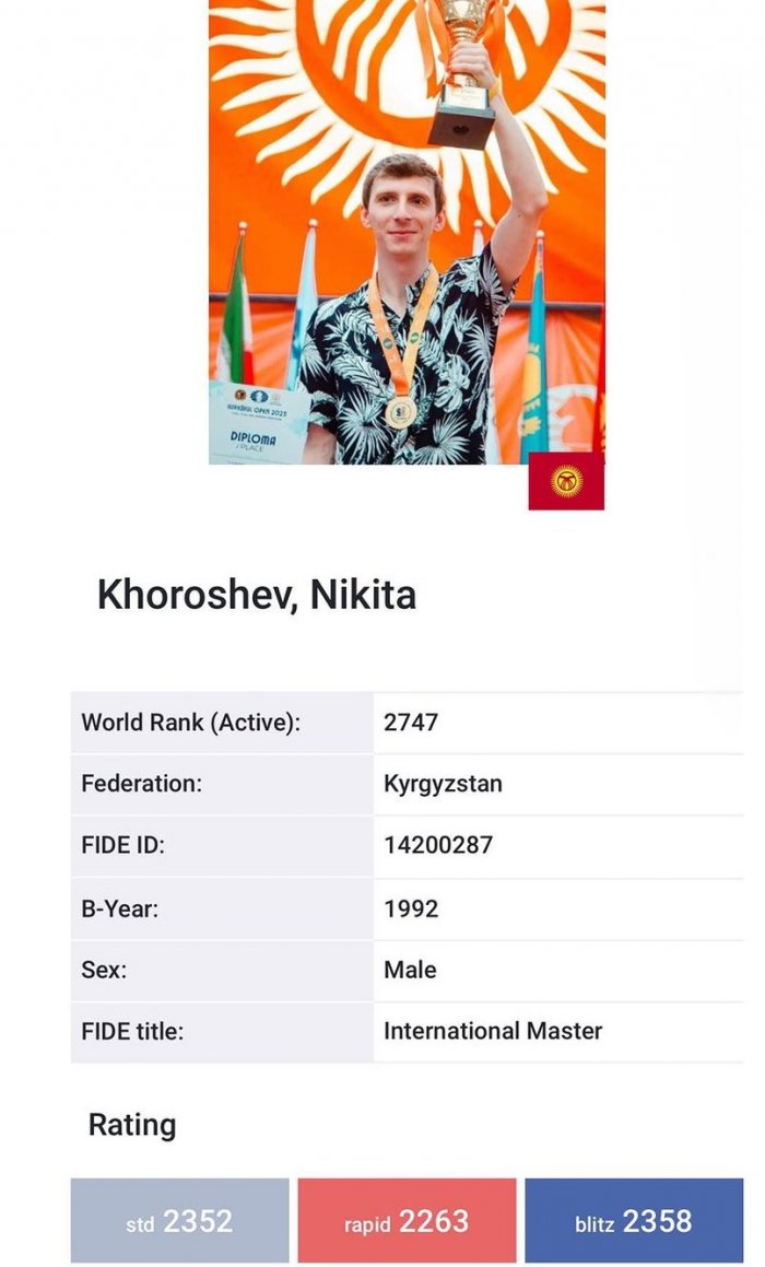Международный мастер Никита Хорошев официально перешел в Кыргызский шахматный Союз. Об этом сообщает пресс-служба организации.