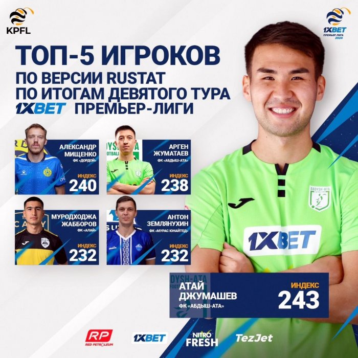 - Жуматаев Арген («Абдыш-Ата») - 1 гол, 98 минут на поле, 83 процента точность передач;