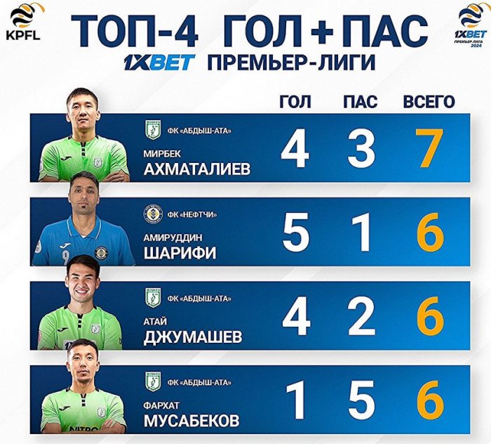 - Мирбек Ахматалиев («Абдыш-Ата») - 7 очков (4 гола, 3 голевых паса);