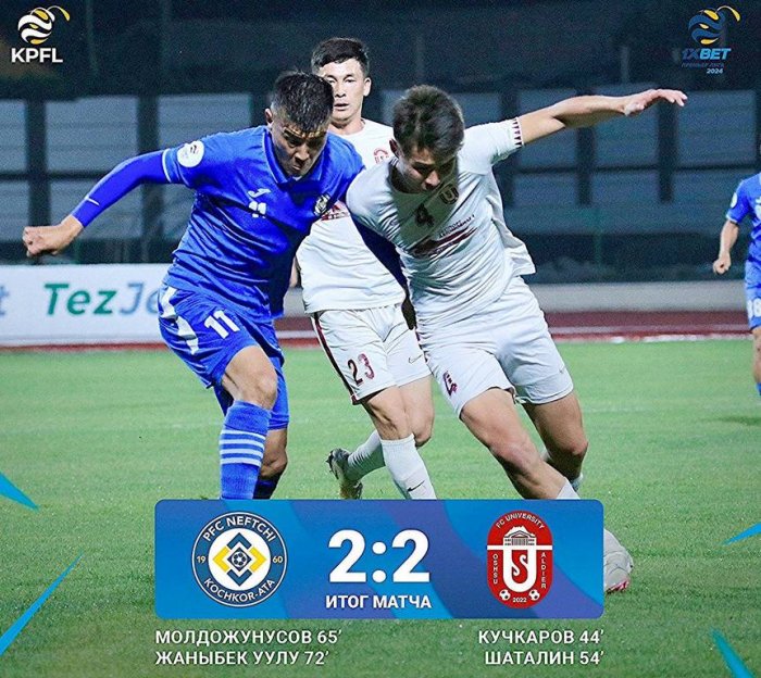 Поединок «Нефтчи» - «ОшМУ-Алдиер», прошедший 13 июня на стадионе «Курманбек» в Джалал-Абаде, завершился боевой ничьей - 2:2.