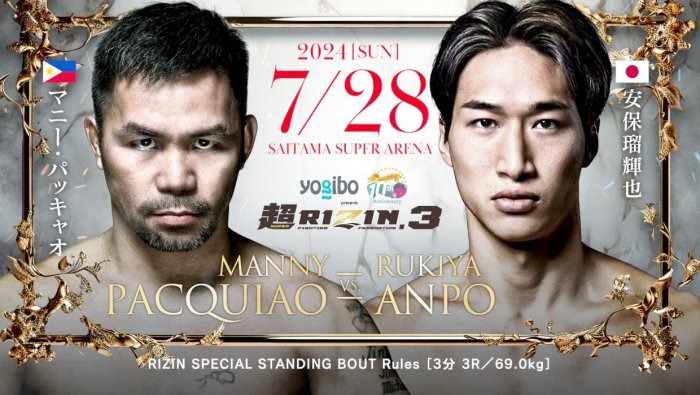 Ранее было запланировано, что 28 июля Пакьяо встретится Чихиро Сузуки. Однако недавно стало известно, что Чихиро получил травму во время выставочного боя с Таканори Гоми. Теперь соперником Мэнни станет Рукия Анпо. Дата проведения поединка остаётся та же - 28 июля.