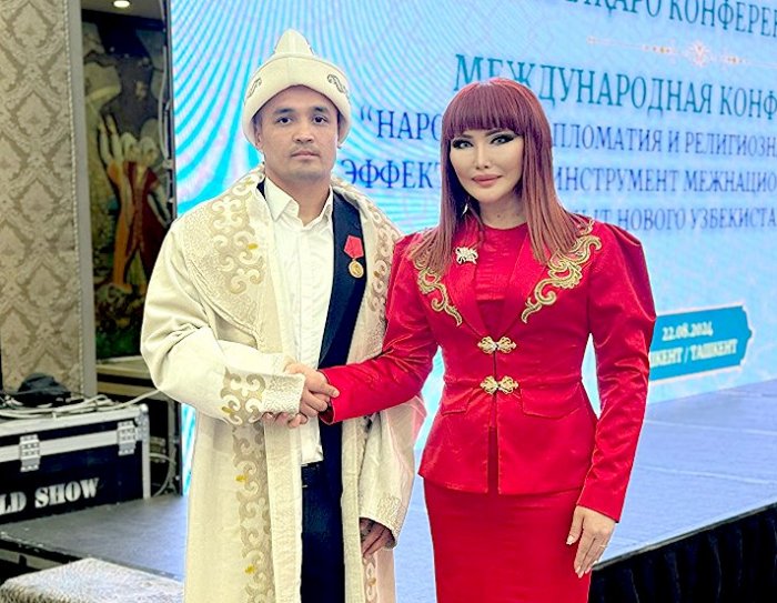 На Международном форуме народной дипломатии по линии ШОС в Ташкенте заслуженный деятель культуры КР, генеральный секретарь Иссык-Кульского форума имени Чингиза Айтматова Ассоль Молдокматова наградила медалью тренера сборной Узбекистана по боксу Акмаля Хасанова.