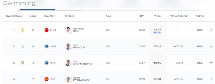 Чемпионом мира на этой дистанции стал Цинь Хайян из Китая с мировым рекордом - 55.47. На втором месте - Кирилл Пригода из России (55.49), а бронзовую награду чемпионата мира завоевал Илья Шиманович (Беларусь) - 55.60.