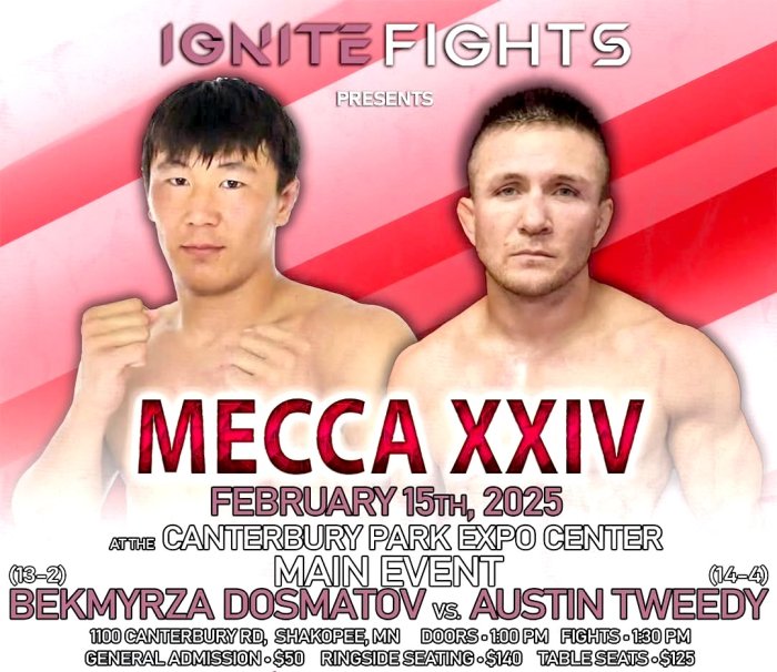 Как сообщает mma_kyrgyz, турнир по смешанным единоборствам Ignite Fights: MECCA 24 пройдет 15 февраля в Миннесоте (США).