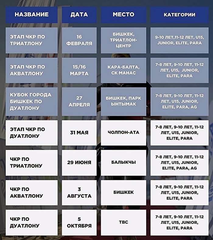 Как сообщается, это - триатлон в Балыкчы (29 июня), а также акватлон в Бишкеке (3 августа).