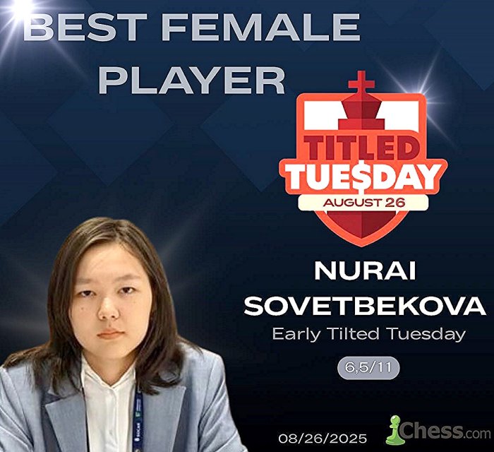 Шахматистка из Кыргызстана Нурай Советбекова стала лучшей среди женщин на онлайн-турнире Titled Tuesday, который прошел 26 августа.