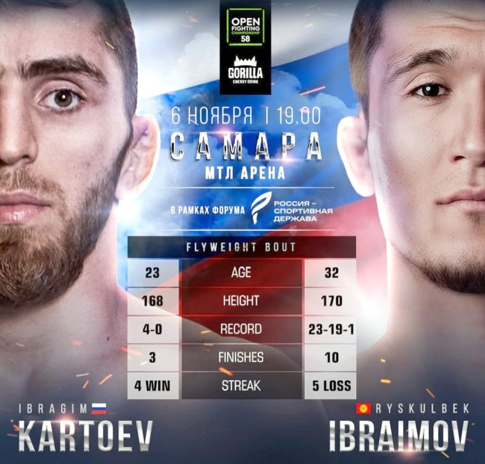 Как сообщают организаторы турнира, в его рамках зрители увидят рейтинговый поединок между 23-летним Ибрагимом Картоевым (4-0) из России и 32-летним Рыскулбеком Ибраимовым (23-19-1) из Кыргызстана.