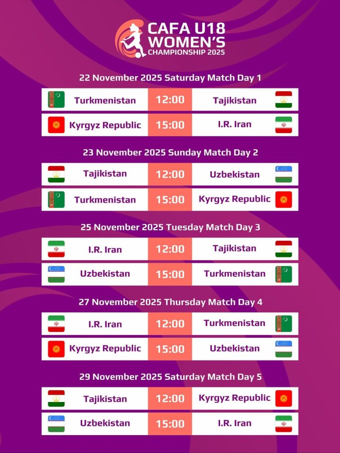 Соперниками сборной Кыргызстана станут команды Ирана (22 ноября), Туркменистана (23 ноября), Узбекистана (27 ноября) и Таджикистана (29 ноября).