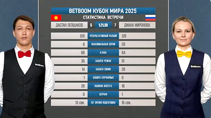 Кыргызстанец Дастан Лепшаков с поражения стартовал на очередном международном турнире «BetBoom Кубок мира» по бильярду, который проходит с 13 ноября по 26 декабря в Москве.