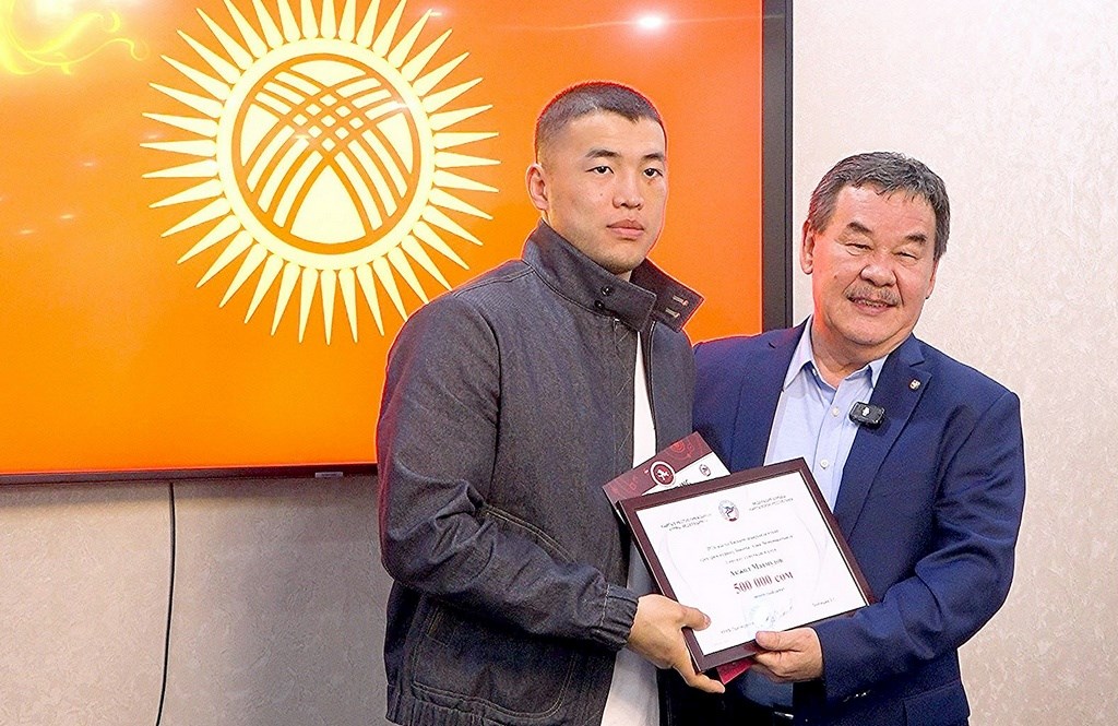- - Бронзовые медалисты (вольная борьба): Яков Чаплин, Абдымалик Карачов, Эрназар Акматалиев и Жакшылык Байташов. От Федерации борьбы - по 300 тысяч сомов, от Азиатского международного университета - по 70 тысяч сомов каждому.