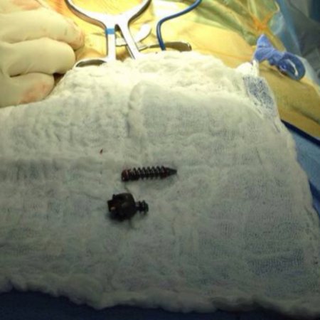 Фотография была сделала в операционной в Израиле 5 марта. На снимке изображен сломанный шуруп, из-за которого спортсмен едва не стал инвалидом. Ранее сюжет об операции Плющенко в Израиле показали в эфире Первого канала.