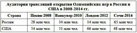 Для сравнения - аналогичный показатель в США составил 48 млн зрителей. При этом национальный телеканал NBC специально показал открытие ОИ-2014 в записи, но в более удобное время - вечерний прайм-тайм.