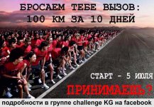«Мы, Евгения Булгакова, Канат Кельсинбеков, Айзада Тыналиева, собираемся пробежать 100 км за 10 дней - и бросаем вам дружеский вызов сделать тоже самое, а, возможно, и за меньшее количество дней! Старт будет произведен 5 июля. Кто готов присоединиться к вызову - добавляйтесь в группу challenge KG на фейсбуке и скидывайте скриншоты треккеров, а мы будем вести статистику. Бегать можно каждый день или не каждый день, или несколько раз в день - главное в тот же день скинуть скриншот. Даже если кто-то завершит 100 км раньше, мы будем отслеживать всех участников ровно 10 дней. Не важен темп, длительность пробежки, рельеф, направление ветра, высота над уровнем моря - важен только километраж! Для финишеров мы предусмотрели памятные подарки, перечень которых мы не оглашаем, просто потому, что это вызов, а не соревнование - призы не так важны! Любой из участников может выдвинуть и свои призы - для дополнительной мотивации», - говорится в сообщении.