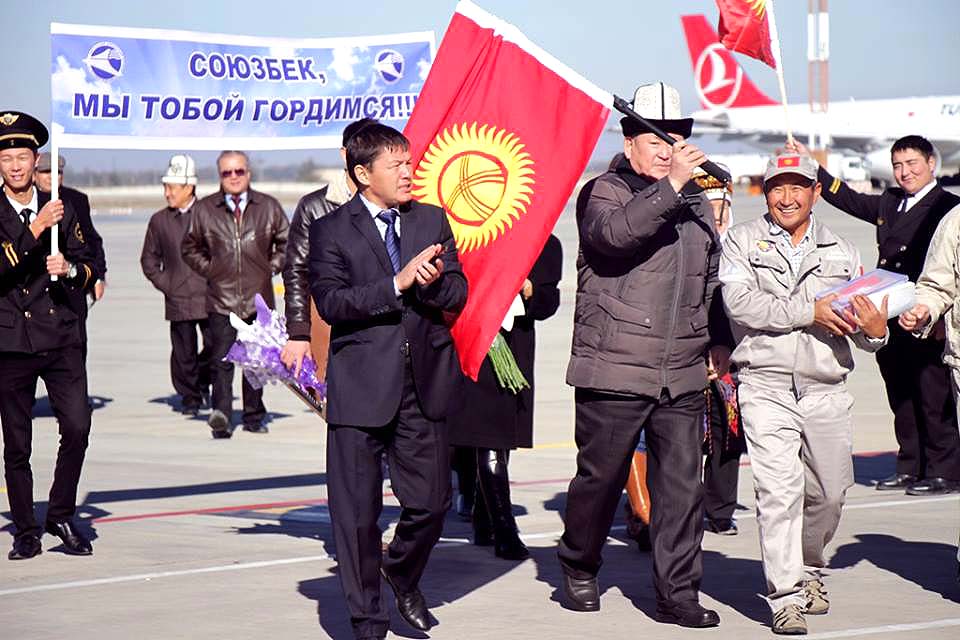 Встречали знаменитого летчика директор Государственного агентства по делам молодежи, физической культуры и спорта Канат Аманкулов, директор Департамента туризма КР Азамат Жаманкулов, друзья, родственники Союзбека Салиева, также студенты Кыргызского авиационного колледжа им. Ишембая Абдраимова КР.