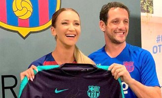 Футболист показал артистке, как правильно переступать через мяч. Тренировка прошла на поле стадиона «Камп Ноу», на котором каталонцы проводят свои официальные домашние матчи.