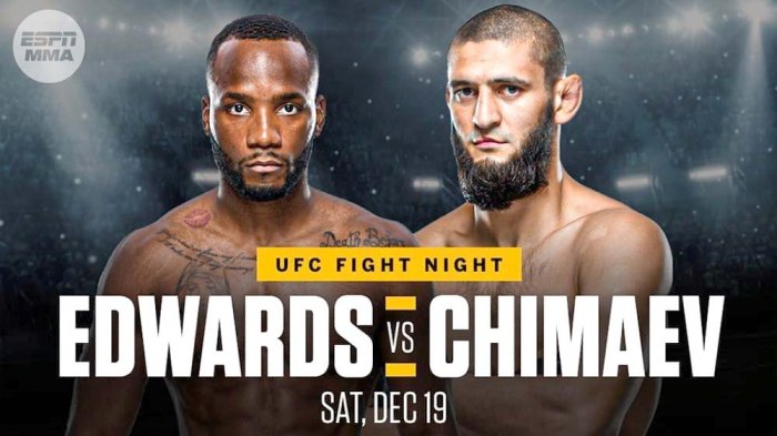Турнир возглавит противостояние полусредневесов Хамзата Чимаева и Леона Эдвардса. Также в главном карде выступит бывший претендент на титул в полусреднем дивизионе Стивен Томпсон, которому будет противостоять Джефф Нил.