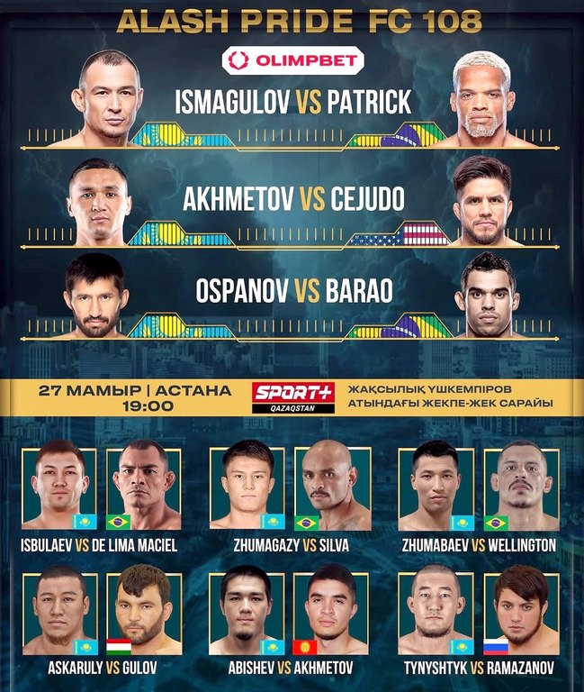 В Астане прошел турнир по смешанным единоборствам Alash Pride FC 108, на котором выступили известные бойцы из Казахстана, Кыргызстана, Таджикистана, Бразилии, сообщает Sports.kz.
