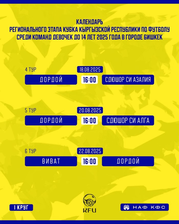 Также в Бишкеке стартует второй круг регионального этапа Кубка Кыргызской Республики по футболу среди девушек до 12 лет.