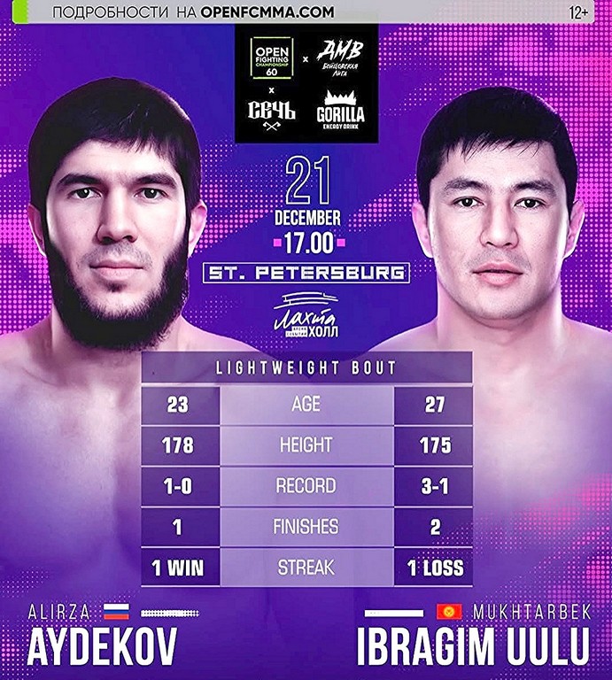 21 декабря бойцы из Кыргызстана Сыймык Сарбашов и Мухтарбек Ибрагим уулу выступят на турнире по смешанным единоборствам в Санкт-Петербурге.