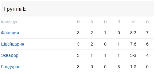 Группа E: Швейцария, Эквадор, Франция, Гондурас