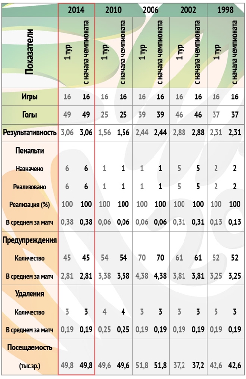 На предыдущих четырёх мировых форумах после первого тура минимальная результативность была на прошлом чемпионате в ЮАР (1,56), а максимальная в Южной Корее и Японии на ЧМ-2002 (2,88). Правда, в Азии львиная доля мячей была забита в двух матчах (Германия — Саудовская Аравия — 8:0 и США — Португалия — 3:2), а в девяти из 16 матчей было забито менее трёх голов. А вот по итогам чемпионата результативность составила всего 2,52 гола за матч.