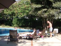 Внизу - расплескавшийся синевой бассейн, окруженный шезлонгами, пальмами и различной степени веселости людьми разного рода занятий и стран проживания. Чуть поодаль - зеленое футбольное поле, на котором пару забугорных толстяков лениво пасуют мяч друг другу - теперь уже сразу видно, что мы приехали на мундиаль!