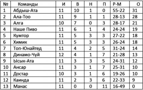 Как сообщает сайт ФФКР, «Наше пиво» минимально одолел «Топ-Юнайтед». «Ала-Тоо» было сильнее «Манаса» - 3:0, а «Каинда» и «Достар» сыграли вничью - 3:3. С одинаковым счетом 5:2 «Алга» обыграла «Ысык-Ату», а «Кумтор» - «Динамо-Чуй». Лидер турнира - клуб «Абдыш-Ата» из Канта разгромил «Ансар» - 5:1 и идет на первом месте в турнирной таблице, набрав 31 очко. В списке бомбардиров лидирует игрок «Абдыш-Аты» Закирбек Пусурманов, забивший 20 мячей, 18 голов забил Бахтияр Айдарханов («Наше Пиво»), по - 14: Турсунбай Касымов («Абдыш-Ата») и Рашид Машанло («Ысык-Ата»).