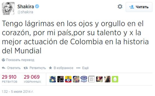 И в завершение цитата со странички известной колумбийской певицы Шакиры: «У меня слёзы на глазах и гордость в сердце за свою страну, за её таланты – это лучший результат на мундиалях в истории Колумбии». Эх, жаль, у наших звёзд нет повода сказать что-нибудь подобное.
