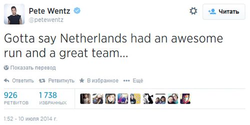 А вот бывший басист и автор песен американской музыкальной группы Fall Out Boy Пит Вентц симпатизировал сборной Нидерландов и очень расстроился из-за их поражения в полуфинале от аргентинцев: «Должен сказать, у Нидерландов великолепная скорость и великолепная команда».