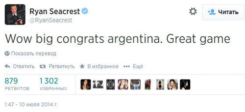 А постоянный телеведущий шоу «Американский идол», лауреат премии «Эмми» Райан Сикрест обращает внимание на тонны пролитых бразильских болельщиков слёз. Он ретвитнул по-своему душераздирающую подборку заливающихся крокодильими слезами фанатов. В то же время он поздравляет победителя второго полуфинала команду Аргентины с выходом в решающую стадию турнира. Интересно, за кого Сикрест будет переживать в финале?