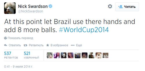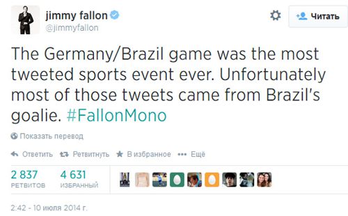 Как справедливо заметил американский актёр Джимми Фэллон, известный по фильмам «Почти знаменит» и «Я соблазнила Энди Уорхола», полуфинальный матч между сборными Бразилии и Германии стал самым популярным спортивным событием в истории «Твиттера». «К сожалению, большинство из них были вызваны голами в ворота сборной Бразилии», — отметил 39-летний актёр.