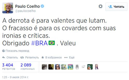 Не мог пройти мимо поражения любимцев классик местной литературы Пауло Коэльо, автор таких произведений, как «Алхимик», «Валькирии», «Мактуб». Он бить лежачего не стал. «Поражение — для тех, кто сражался храбро. Провал – для трусов с их критикой и насмешками. Спасибо, сборная Бразилии», — поддержал команду писатель. И несмотря на отсутствие любимцев в финале чемпионата мира, Коэльо собирается посетить 13 июля «Маракану». Наверное, в надежде, что немцы не позволят ненавистным аргентинцам стать чемпионами мира на его родине.
