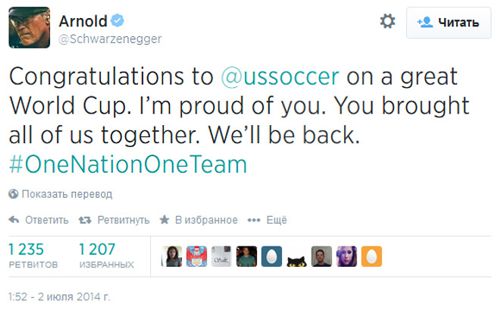 Несмотря на поражение, сборную США на родине приняли очень доброжелательно, а всемирно известный актёр и экс-губернатор Калифорнии Арнольд Шварцнеггер поблагодарил команду за хорошее выступление: «Поздравляю сборную США с прекрасным выступлением на Кубке мира. Я горжусь вами. Вы объединили нас всех». И в завершение коронное, но слегка изменённое «We’ll be back». Что ж, будем ждать. Вдруг на чемпионате мира в России можно будет увидеть Арнольда в майке американской сборной лично?