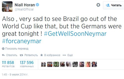 Вообще, разгром бразильцев вызвал в мире разные эмоции. Помимо ликования тех, кто желал сборной Бразилии всех невзгод, были и те, кто искренне поддерживал эту команду. Известный ирландский певец, участник шоу X-Factor Найл Хоран написал: «Очень грустно видеть Бразилию, вылетающую с Кубка мира, но Германия сегодня вечером была великолепна!»