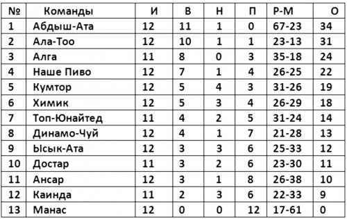 На три очка от команды из Канта отстает «Ала-Тоо», обыгравший «Химик» - 5:0. Кстати, хет-триком в этом матче отметился Касымов. На третьем месте закрепилась «Алга», разгромившая «Ансар» - 7:1.