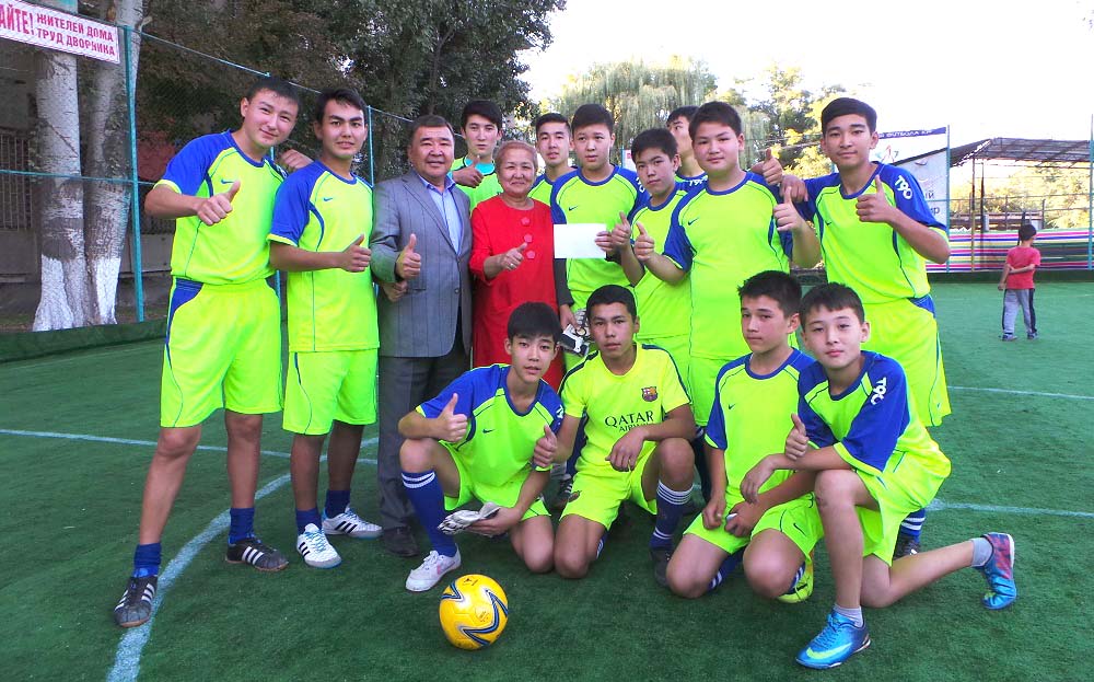 По завершению мероприятия участники футбольных команд смогли сделать групповое фото с Аскаром Салымбековым и Дамирой Долоталиевой.