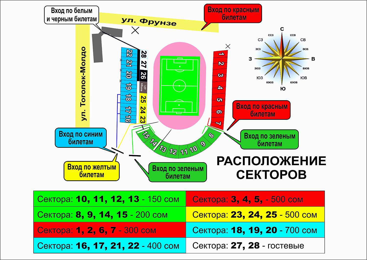 - На опубликованной схеме подробно расписан ценовой диапазон. Цвет билета соответствует цвету сектора на стадионе. Проходы на соответствующие сектора обозначены на схеме стадиона. Пожалуйста, планируйте свой маршрут и вход на стадион заранее согласно схеме рассадки, - говорится на сайте ФФКР.. - Оригинальные билеты имеют 3 степени защиты. Будьте предельно внимательны и остерегайтесь подделок. Без печати налоговой службы КР и Федерации футбола билет является недействительным.
