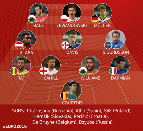 Запасные: Чиприан Тэтэрушану (Румыния), Жорди Альба (Испания), Камиль Глик (Польша), Марек Гамшик (Словакия), Иван Перишич (Хорватия), Кевин де Брюйне (Бельгия), Артем Дзюба (Россия).