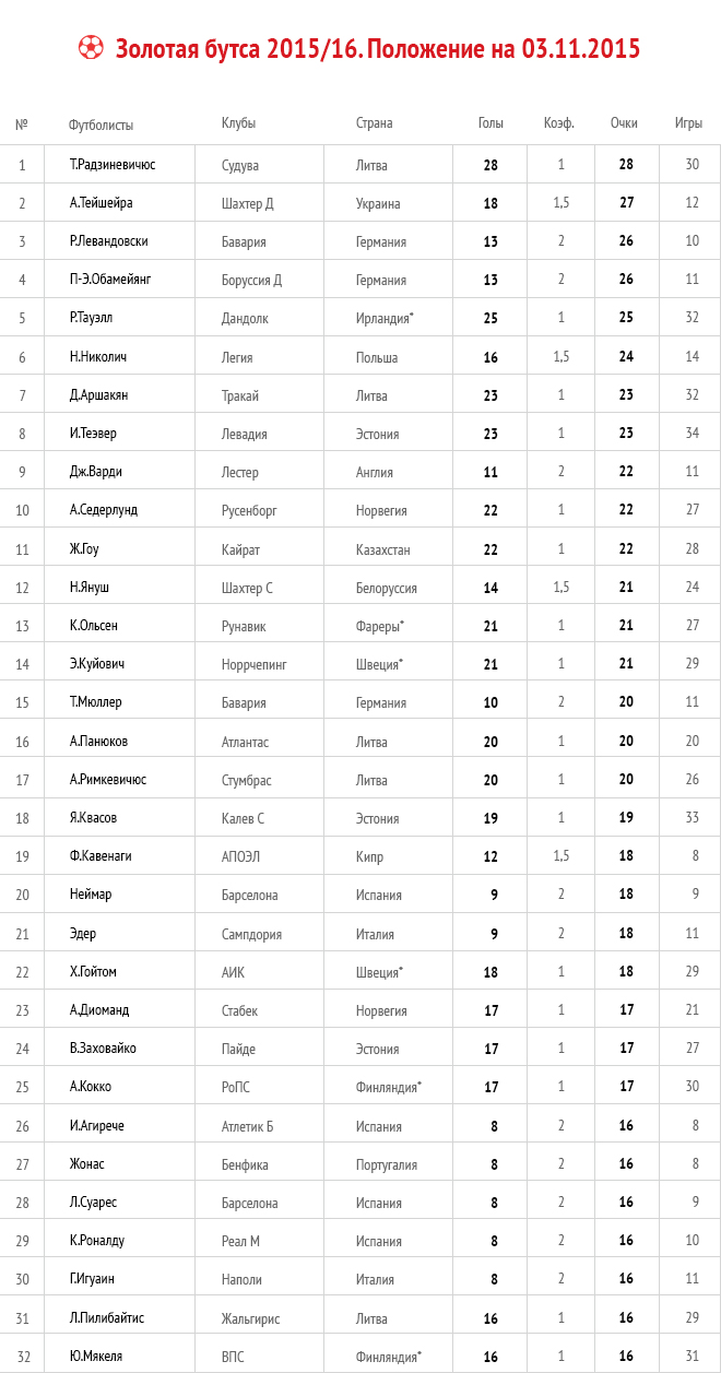 Европейские футбольные чемпионаты, проводящиеся по системе «осень-весна», постепенно набирают ход. И это уже отразилось на нашей таблице. Если месяц назад в топ-30 присутствовали всего 5 футболистов из этих лиг, то на сегодня их уже 14. В дальнейшем процесс пойдет быстрее, так как ряд лиг, играющих по системе «весна-осень», уже завершили сезон, а в других осталось сыграть от одного до трех туров.