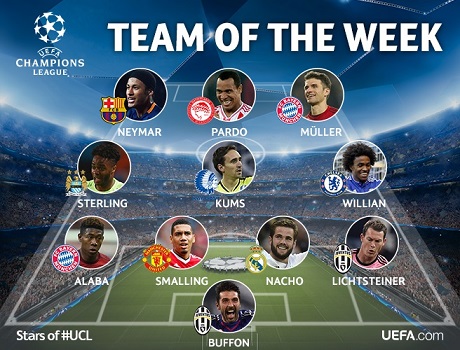 В состав линии атаки включены Неймар («Барселона»), Томас Мюллер («Бавария») и Фелипе Пардо («Олимпиакос»).