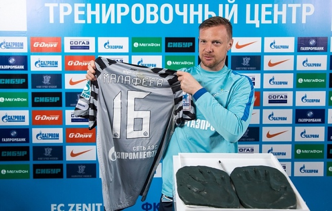 Вратарь «Зенита» Вячеслав Малафеев включён в Зал славы петербургского клуба, сообщает пресс-служба сине-бело-голубых. Перед сегодняшней тренировкой команды в Удельном парке, которая стала для него последней, голкипер оставил свой автограф на отпечатках своих рук.