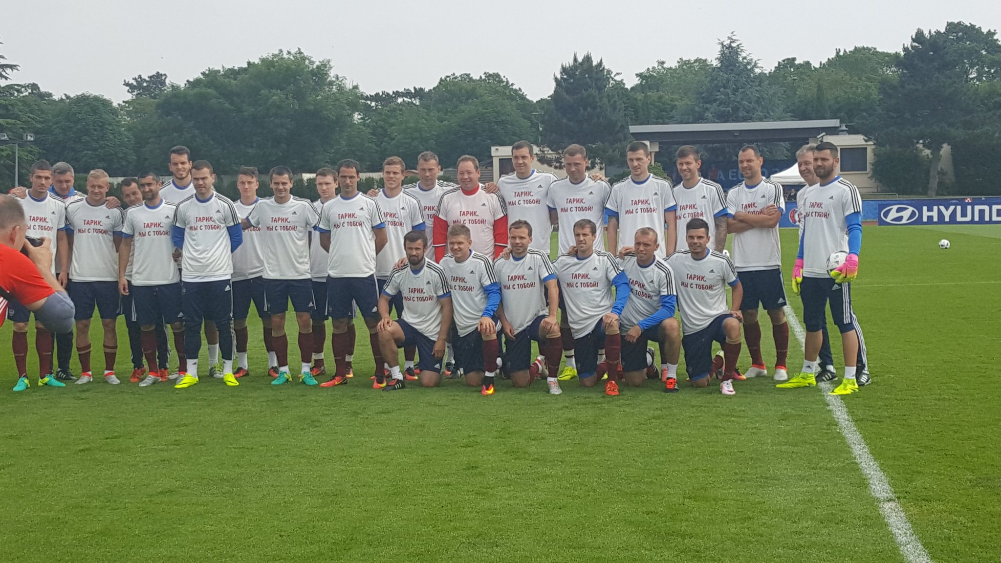 Сборная России поддержала травмированного хавбека Игоря Денисова. Футболисты вышли на сегодняшнюю тренировку в майках с надписью «Гарик, мы с тобой!».