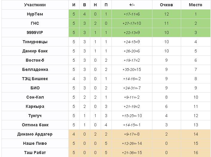 Список бомбардиров после 5-го тура: Канетов Эмиль («Белладонна») - 20, Асанбеков Нурсултан (ГНС) - 10, Кольбаев Арзат («Демир банк») - 9