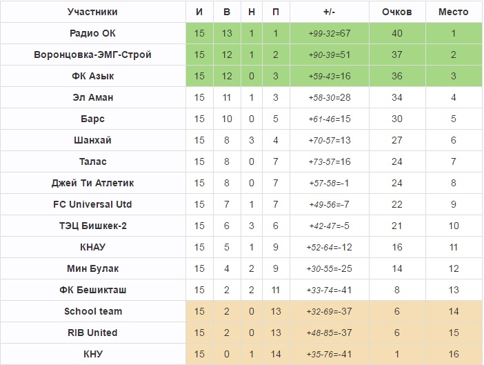 На протяжении всей дистанции «связисты» удерживали лидерство в III Дивизионе. Ведомые Акжолом Киизбаевым, игроки команды «Радио Ok» по праву финишировали на первой строчке и теперь в следующем сезоне сыграют дивизионом выше. Второе и третье место заняли «Воронцовка» и «Азык», соответственно.