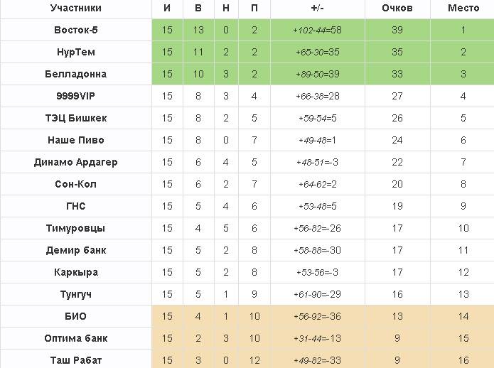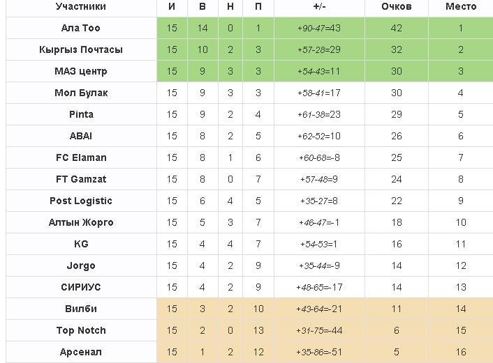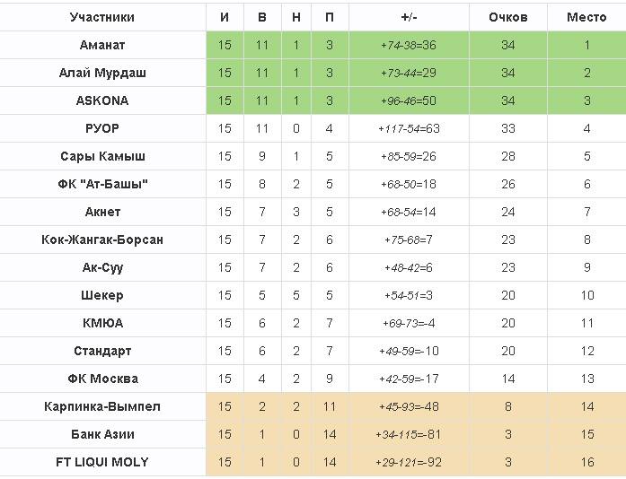 Пожалуй, именно второй дивизион подарил нам самую захватывающую концовку сезона, ведь именно там сразу пять команд решали судьбу всех трех комплектов медалей. Подумать только: лидировавшая до последнего тура команда РУОР, проиграв «Алай Мурдашу», не только упустила чемпионство, но и вовсе оказалась за пределами призовой тройки. А победа «алайцев» больше всего сыграла на руку ребятам из «Аманата», которые, разгромив с неприличным счетом «Ат Башы», стали чемпионами второго дивизона!