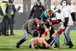 21 сентября в матче 1/16 Кубка Украины в Ивано-Франковске встретились «Карпаты» и «Прикарпатье». Еще до начала матча правоохранительные органы были обеспокоены безопасностью на стадионе, ведь фанаты из Львова знамениты своим агрессивным поведением. Так вышло, что к середине второго тайма «Карпаты» проигрывали 0:2. И это в матче с командой, которая выступает в третьей лиге Украины. Терпение болельщиков лопнуло, и на 66-й минуте они выбежали на поле, прорвав оцепление. Футболисты тут же поспешили в сторону раздевалок – на поле остался лишь Игорь Худобяк. Мирно побеседовать с болельщиками не удалось, поэтому вскоре к нему на помощь пришел защитник сборной Украины Артем Федецкий. И ему тут же досталось: фанат ударил футболиста по лицу. Все это происходило на глазах у полиции, которая, хоть и находилась рядом, не стала вмешиваться в потасовку. Когда страсти улеглись, игра продолжилась. Один гол гости отыграли, но от поражения не ушли и вылетели из Кубка. История на этом не закончилась. По дороге домой автобус с львовской командой был остановлен фанатами на трассе, и спасать «Карпаты» вынужден был спецназ.